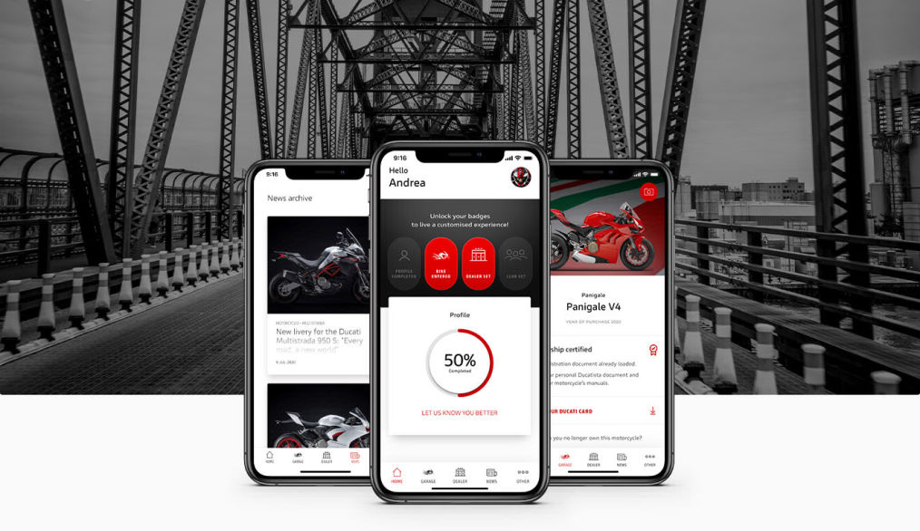 The MyDucati App is your privileged access to the Ducati world. Wherever you are and at any time you can check all the information about your bikes, locate the nearest dealer and save it as a favourite to contact them quickly. You'll receive information about the new services that we're developing specifically for you and the events organised in your country and around the world. You can manage your relationship with the local D.O.C., a community where you can share your passion.